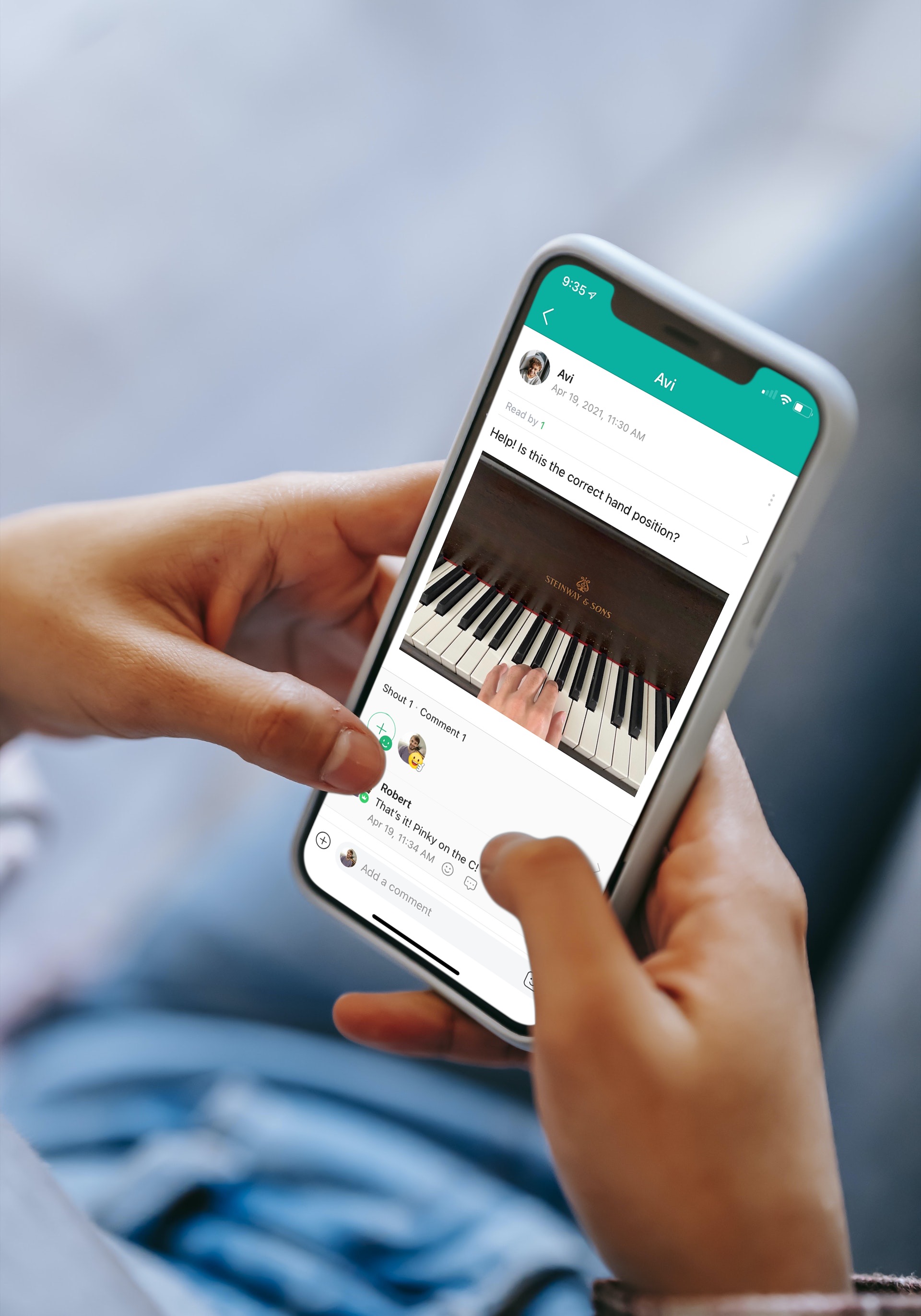With Band, it’s almost as if I’m always sitting next to you while you’re practicing. Comment on the video you’re working with and ask for help. Take a picture of your sheet music or hands to confirm you’re doing the correct thing. Ask questions. And I will be able to answer them with a few words, a picture, video, and more.